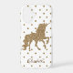 Adorable gold glitter unicorn on gold polka dots with your name.