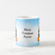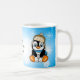 A cute funny hand drawn cartoon penguin with snowballs and snowflakes background. Personalised coffee mug.