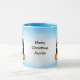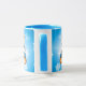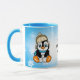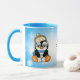 A cute funny hand drawn cartoon penguin with snowballs and snowflakes background. Personalised coffee mug.
