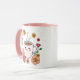 A cute little Kawaii cartoon mug of coffee surrounded by yellow and pink flowers. Start your morning out with this cuteness.
