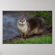 A charming Asian short-clawed otter rests on the water's edge, framed by lush green grass in the foreground.
