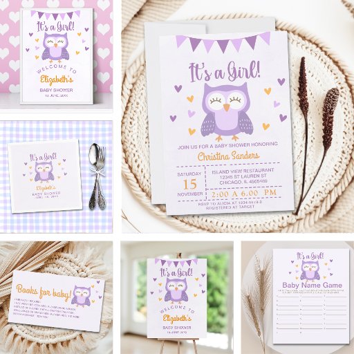 "Celebrate in style with this cute boho owl themed baby girl shower design. Featuring the phrase 'It's a Girl' in warm shades of purple and pink, it's perfect for welcoming your little one on the way! For complementary products, check out this cute baby girl shower design's collection.
