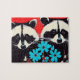 Adorable Raccoons With Blue Flowers Red Background Jigsaw Puzzle