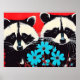Adorable Raccoons With Blue Flowers Red Background Poster