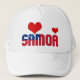 Adorable Samoa Flag Hearts Patriotic Trucker Hat with the inscription "Samoa" displayed on the front of the hat. Inscription is infused with the pattern and the colours from the Samoa national flag. Two red hearts, one big and one small finish the design. Hearts are fully customisable or removable using "Customise it!" feature. Base hat colour complements the design very well. This delightful hat is a lovely and unique gift. © CountriesOfTheWorld