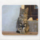 wonderful kitten with grey stripped fur, posing nicely on a bench in the garden of an austrian farmer's house