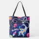 Fantastic image on a customised tote bag of a cartoon spaceman floating in space amongst colourful planets. Click on "Personalise" to customise with your name or other text you like.