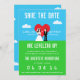 This fun, unique, and delightfully geeky save the date wedding announcement features 8-bit bride and groom characters gazing at each other in front of a red heart, with a bright blue sky with fluffy white 8-bit clouds.