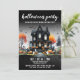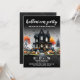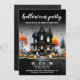 Welcome guests to your Halloween costume party with this spooky yet simple invitation featuring a dark, moody distressed background and white and orange fonts. The design keeps a bold and classic look with a mix of script typography and strong serif fonts. A black haunted house sits at the centre, accented by pops of orange from pumpkins, jack-o'-lanterns, and creepy trees. Cute ghosts and bats add a playful touch, while the grunge-inspired fonts give it a vintage gothic vibe.
