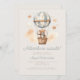This cute baby shower invitation features a sweet watercolor teddy bear in a blue and white striped hot air balloon, above the words "Adventure awaits!" in dusty blue retro script. Personalise the text with the name of the mum-to-be in script and the details in sans serif font on a beige background. The reverse side provides space for diaper raffle, books for baby, and registry details, along with a convenient QR code guests can scan to visit the registry. Ideal for a boy's baby shower.