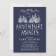 Adventure awaits boys baby shower invitation featuring sketched mountains & trees with a hand drawn star font set on a midnight blue invitation. Flip our shower invite over to view a coordinating blue back with tribal arrows.
