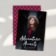 Trendy graduation announcements featuring the graduate's vertical photo with "Adventure Awaits" in white handwritten script lettering. Personalise the front of the Adventure Awaits graduation announcements by adding the graduate's name, school name, and graduation year. The announcement reverses to display an elegant burgundy and white trellis pattern.
