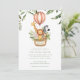Celebrate a sweet new beginning with this Adventure Awaits safari baby shower invitation, featuring a charming storybook watercolor illustration of safari animals floating in a hot air balloon. A gentle lion, giraffe, elephant, zebra, and playful monkey are nestled together in a woven basket, surrounded by soft greenery for a warm and whimsical look.