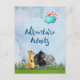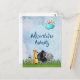 A postcard which says adventure awaits. Set on a light blue watercolor background. A blue cloud and an orange sun sit in the sky. A meerkat, gorilla and hippo all together on some savannah grasses, about to embark on some adventure.