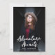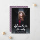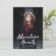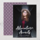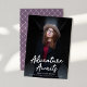 Trendy graduation announcements featuring the graduate's vertical photo with "Adventure Awaits" in white handwritten script lettering. Personalize the front of the Adventure Awaits graduation announcements by adding the graduate's name, school name, and graduation year. The announcement reverses to display an elegant purple and white trellis pattern.