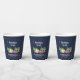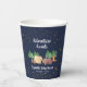 Cute baby shower paper cups featuring an illustration of woodland animals with their tent camping in the mountains and forest, an overlay of gold stars, and "Adventure Awaits" and the mother-to-be's name in white script against a midnight blue background.