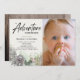 This chic "the adventure continues" 1st birthday photo invitation features a cream white background with a brown bear and a deer in a forest in the mountain. The reverse side features a wood background. Personalise for your needs. You can find more matching products at my store.