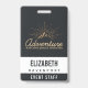 Personalised name badge with a gold coloured illustration on a black-grey background. Designed with an illustration of a mountain with the suns rays shining outward from behind. Typography says: Adventure explore dream discover.
