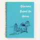 Teal background with quick sketch of buildings with a title to embody traveling notebook
