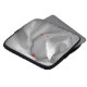 A close-up of a flaming orange and yellow rose desaturated down to a quieter black and white. Only the water droplets sprinkled on its soft grey petals give a hint of the original sunny colours.