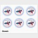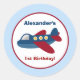 Aeroplane transportation theme design. This cute round sticker is customised with your own 2-lines of text.