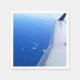 A photo of an aeroplane’s wing over a mostly clear sky with just a few clouds. The aeroplane was flying over a lake at the time.