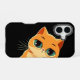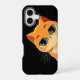A phone case featuring a cartoon-style illustration of an orange cat with big, expressive eyes against a black background. The vibrant colours and cute design can attract attention and make the phone case visually appealing. A cat-themed design can resonate well with animal lovers and provide a fun way for individuals to express their personality. Beyond aesthetics, phone cases serve a practical purpose by protecting devices from scratches, drops, and general wear and tear. The playful design can complement various outfits and personal styles, making it a versatile accessory. This type of design makes for a thoughtful gift for friends or family members who love cats or unique art.