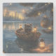Set sail into the magic of the holiday season with this beautifully detailed illustration, showcasing a proud dog sitting in a festively decorated boat, gliding across a serene Christmas lake. The twinkling lights from nearby pine trees reflect off the water, casting a warm, festive glow that enhances the cosy ambiance. Ornaments dangle from the boat's sides, while glowing lanterns light the way, creating a scene that captures the true essence of Christmas warmth and joy. This nostalgic artwork brings a touch of holiday magic to any space, perfect for those who cherish the spirit of the season.