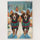 This festive design captures the joyful spirit of the holiday season, featuring an adorable dogs.Nestled in a winter wonderland, complete with a decorated Christmas tree, and beautifully wrapped presents. Snowflakes gently fall, adding a magical touch to the scene, while the vibrant colours of the holiday decorations create a warm and cheerful atmosphere.