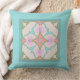 Design on this throw pillow features a centuries old tile pattern from Afghanistan updated w/a beautiful blend of pastel colours incl. peachy coral, icy pink, limpet shell blue, new leaf green & pale greyed lilac. Variation on back is a smaller version of front tile w/ wide aqua borders. See coordinating Pillows & other products.