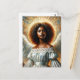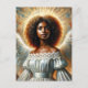This afrocentric fantasy postcard features classic oil painting style image of a young Black woman angel with curly hair wearing an elegant white off-the-shoulder dress, surrounded by radiant light with a halo-like effect. A melanin-rich angelcore aesthetic stationery item great for fans of female fantasy art, and Christian/biblical figures.