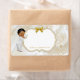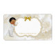 Beautiful baby boy in his christening suit and gold cross necklace. Background is white satin & gold filigree with a gold and silver glitter frame and bow embellishment. Text left blank to write in each address and use as a mailing label.