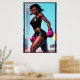 A portrait of a young African American boxer with black hair in black clothes wearing pink boxing gloves. This is a AI generated art.