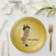 Bee baby shower paper plates with adorable African American baby boy wearing a cute bumble bee outfit on a rich gold background with flying bumble bees. You can add text to personalise these black and gold bee baby shower paper plates, and you can remove the gold background to add the colour of your choice.