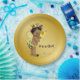 Bee baby shower paper plates with adorable African American baby girl wearing a cute bumble bee outfit on a rich gold background with flying bumble bees. You can add text to personalise these black and gold bumble bee baby shower paper plates, and you can remove the gold background to add the colour of your choice.