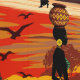 Beautiful Woman African Silhouette dressed with Wax traditional Fabric Dress, carrying a hand made decorated jar, Walking in the Amazing Nature of the African Savanna, on a warm and Peaceful Sunset. Original Vector Illustration Copyright BluedarkArt TheChameleonArt.
