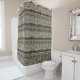 A shower curtain with a geometric pattern inspired by traditional motifs from Africa. It has a black ink pattern with neutral colour stripe background colours and a distressed texture for a rustic feeling. Perfect for a safari or African themed bathroom or for anyone that likes African decorative designs.
