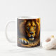 A fearless tiny ant stands boldly on the ground, gazing up at a massive, majestic male lion towering above with flowing golden mane and piercing amber eyes. This stunning artwork captures the powerful message that true courage makes us all equal, no matter our size. Dramatic low-angle perspective emphasizes the epic scale contrast between the delicate insect and the king of the jungle, bathed in warm golden hour light with hyper-detailed fur and exoskeleton textures.