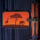 African safari landscape background featuring silhouettes of a giraffe, a tree and an elephant against the sunset in orange and red colour shades.