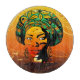 My Design features a stylised portrait of a Beautiful African woman wearing a colourful headwrap. The headwrap is adorned with green and yellow leaf patterns. Her face is filled with a sunset silhouette, complete with birds flying across the sky and a landscape with trees. She wears large, ornate earrings and a beaded necklace. Original Pop Art Style Vector Illustration Copyright BluedarkArt TheChameleonArt.