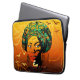 My Design features a stylised portrait of a Beautiful African woman wearing a colourful headwrap. The headwrap is adorned with green and yellow leaf patterns. Her face is filled with a sunset silhouette, complete with birds flying across the sky and a landscape with trees. She wears large, ornate earrings and a beaded necklace. Original Pop Art Style Vector Illustration Copyright BluedarkArt TheChameleonArt.