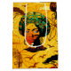 My Design features a stylised portrait of a Beautiful African woman wearing a colourful headwrap. The headwrap is adorned with green and yellow leaf patterns. Her face is filled with a sunset silhouette, complete with birds flying across the sky and a landscape with trees. She wears large, ornate earrings and a beaded necklace. Original Pop Art Style Vector Illustration Copyright BluedarkArt TheChameleonArt.