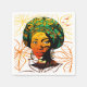 My Design features a stylised portrait of a Beautiful African woman wearing a colourful headwrap. The headwrap is adorned with green and yellow leaf patterns. Her face is filled with a sunset silhouette, complete with birds flying across the sky and a landscape with trees. She wears large, ornate earrings and a beaded necklace. Original Pop Art Style Vector Illustration Copyright BluedarkArt TheChameleonArt.