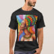 I give wanted to give this a 4 instead of a 5 because these Basic DARK T0shirts run unexpectedly SLIM or Narrow. Which is great if you do not have a potbelly, but I have a paunch. It isn't the shirt's fault that I've got a beer belly. The design and shirt itself is a quality cotton shirt. The color is more of a deep purple, but still a very pretty color. The Basic DARK T-shirts run a bit SLIMMER than the Basic Ts. The neck is a fraction narrower (or seems to be narrower) also. I'm a paunchy middle-aged woman and my neck is 12 inches (31cm) thick and the neckline fell about the same as in the photo of the man, and I had the desire to tug it a bit. So if you're a thick necked man or like loose shirts, be aware these are slimmer shirts. Once I get rid of my lockdown paunch it'll look great. The shirt washed well in cold water with no apparent bleeding. We don't have a dryer, so it hung dry. Did not shrink. Love the colors and the design. The design looks smaller on my shirt than it does on the model on-line. But still, it looks good on the shirt. The printing looks as it does on the model, just the size seems fractionally smaller. Washed garment in cold water, hung dry and design appeared unaffected.
