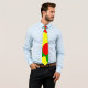Whimsical neck tie designed using different sizes of red, yellow and green polka dots on a black background. Customers can move and resize each dot.