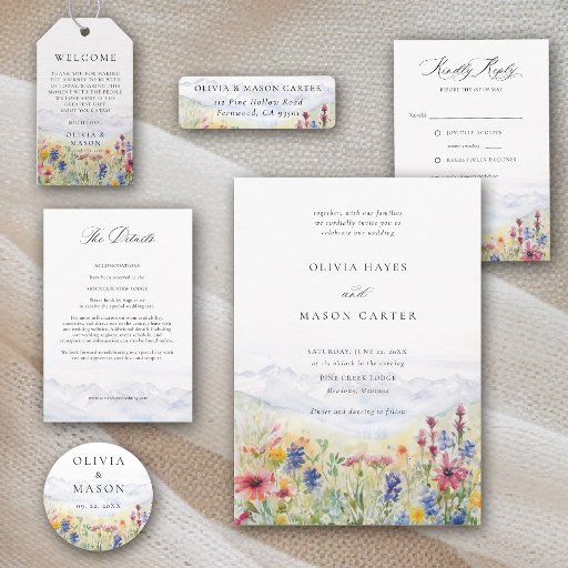 Perfect for mountain, meadow, or wildflower-themed weddings, this customisable template allows you to personalise all details—date, time, location, and RSVP information—easily through Zazzle’s design tool.