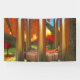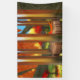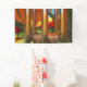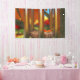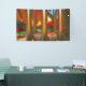 After the wind a single fallen leaf lies where it fell on a silent wind chime. On the ground beneath the still-green grass is covered with yellow and red leaves. In the background a crimson and gold autumn orchard reflects its colours in the silver bars of the chime.