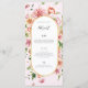 This romantic floral wedding menu features soft watercolor garden blooms set against a blush background for a refined and feminine look. Delicate florals in blush, peach, and warm greenery frame an elegant arched layout, creating a menu design that feels timeless, graceful, and thoughtfully styled.