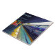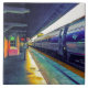 Afternoon Train, the title of the artwork on this Ceramic Tile, is an original photograph by ZoeSPEAK, done in primary pastel colours. The shiny, silvery blue train is stopped at the station, where the yellow sunlight reaches the platform, and lights up the pink wall of the building.