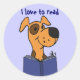Cute cartoon dog reading a book says I love to read. On the news recently there was a story about a library that had volunteer dogs come and help kids read. The kids would sit with a dog on their laps and read to the dogs. It helped the kids learn to read and the dogs loved it. Fun for all. Great gift idea.